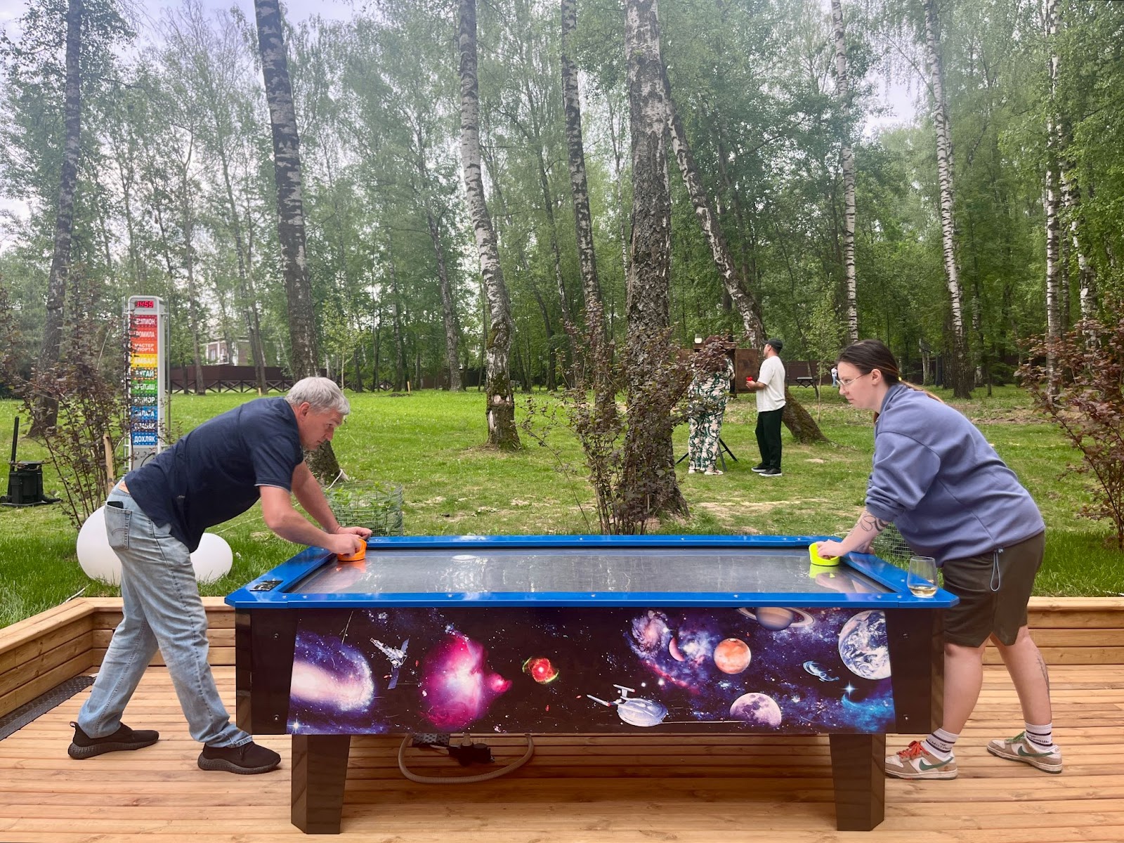 Космический аэрохоккей гармонично вписался в природный ландшафт рыболовного клуба «Золотой Сазан» в Подольске. Стол с яркими космическими изображениями и синими бортами установлен на деревянном настиле среди берез, создавая необычный контраст высоких технологий и природы. Участники корпоративного мероприятия с удовольствием соревнуются за аэрохоккеем, наслаждаясь свежим воздухом и зеленью вокруг. На заднем плане виднеются другие развлечения и гости, которые в них играют.