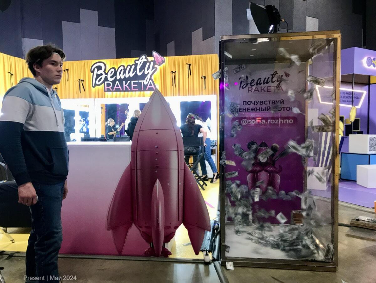 Аренда денежной кабины на мероприятие предоставляет уникальные возможности для привлечения внимания аудитории в сфере блогинга и инфлюенс-маркетинга. На конференции INSTADIUM, проходившей на площадке Main Stage в Москве, бренд BEAUTY-ракета организовал эффектную фотозону с денежной кабиной под слоганом "Почувствуй денежный поток". Особенностью данной активации стало использование кабины не для интерактивного взаимодействия (ловли купюр), а в качестве яркой фотозоны, привлекающей внимание блогеров и создающей возможности для генерации вирусного контента. Брендирование кабины включало логотип компании и Instagram-аккаунт, что способствовало повышению узнаваемости бренда и увеличению числа подписчиков. Дизайн стенда был выполнен в узнаваемых фирменных цветах бренда (розовый, желтый) с характерным элементом — большой розовой ракетой, что обеспечивало цельность визуальной концепции. Такой формат использования денежной кабины на тематической конференции демонстрирует гибкость применения аттракциона и его эффективность для решения маркетинговых задач в среде, где основной валютой являются впечатления и контент.