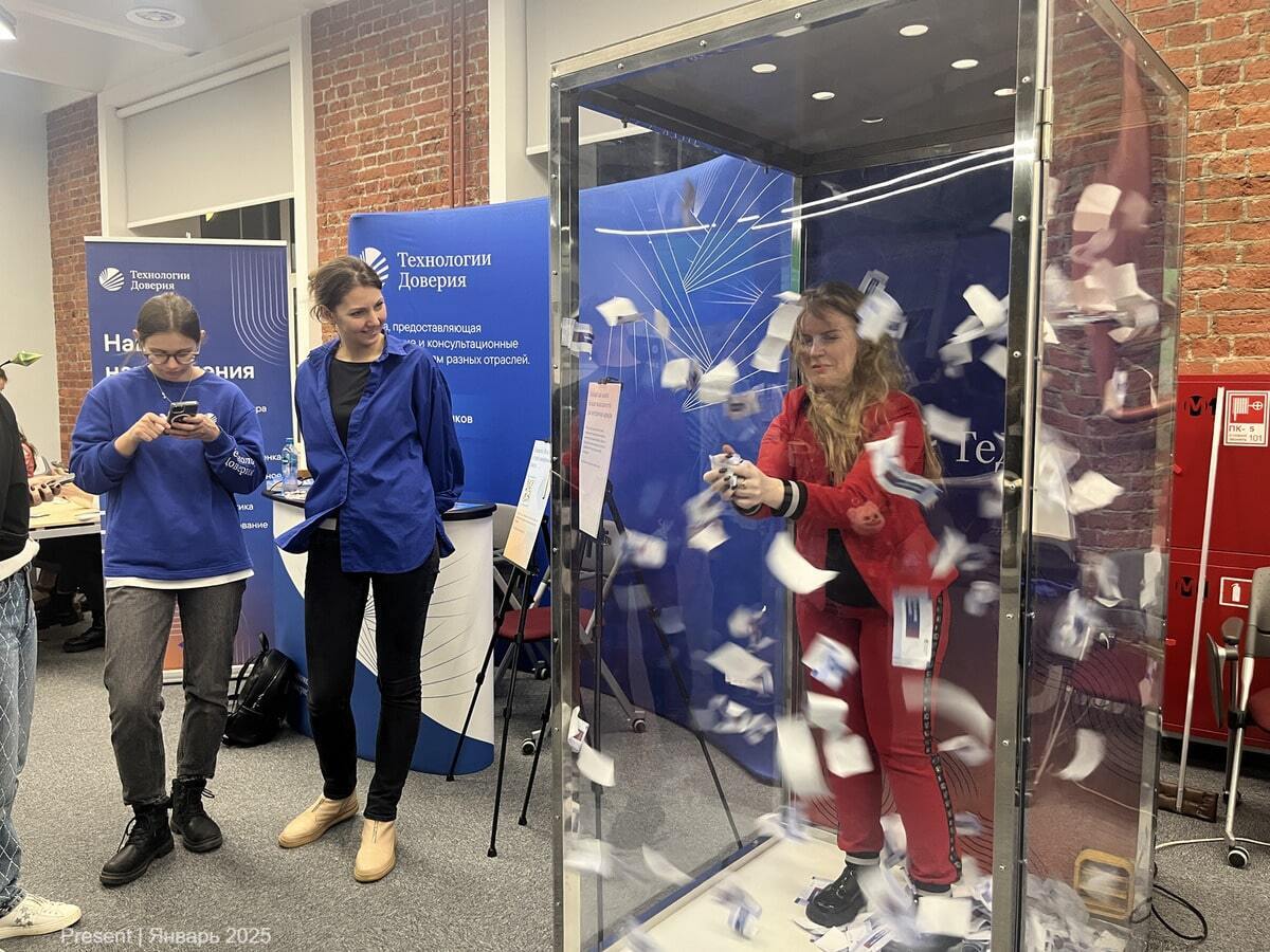 Аренда денежной кабины на мероприятие позволяет эффективно привлекать внимание студенческой аудитории. Компания "Технологии Доверия" использовала этот интерактивный аттракцион в День студента для знакомства с потенциальными стажерами. Вместо денег в кабине летали информационные флаеры о преимуществах компании. Участники соревновались, кто поймает большее количество флаеров, что создавало азартную атмосферу. Стенд оформлен в корпоративных синих тонах с логотипом компании. Контрастное сочетание кирпичных стен университетского пространства и современной прозрачной кабины привлекало внимание всех проходящих студентов и стало одной из самых популярных активностей мероприятия.