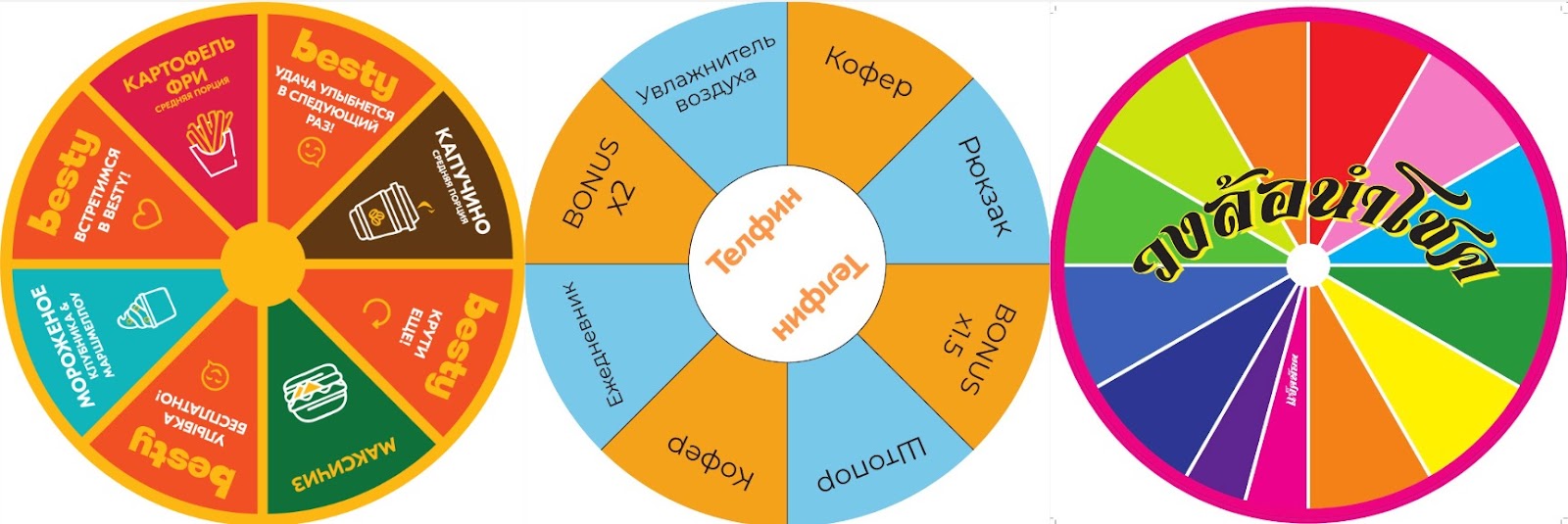«Колесо фортуны» было разделено на 9 секторов, в каждом из которых обозначался приз – от ценных (например, iPhone) до символических (например, стиральный порошок). Каждый участник получал возможность испытать удачу: шансы выиграть дорогой или символический приз составляли примерно 50 на 50.