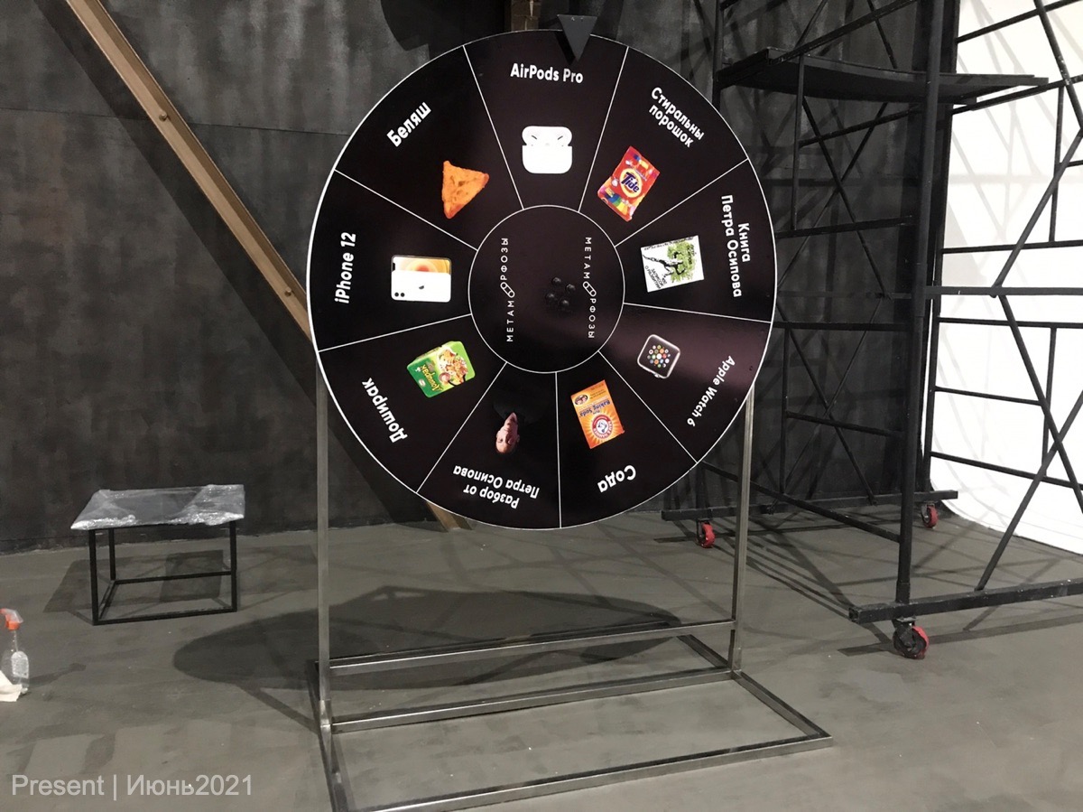 Колесо фортуны диаметром 1,5 метра стало ярким интерактивным элементом презентации. Для мероприятия было подготовлено индивидуальное брендирование колеса – на складе специалисты Present Rent нанесли тематическую наклейку, что сделало аттракцион 100% подходящим под сценарий.