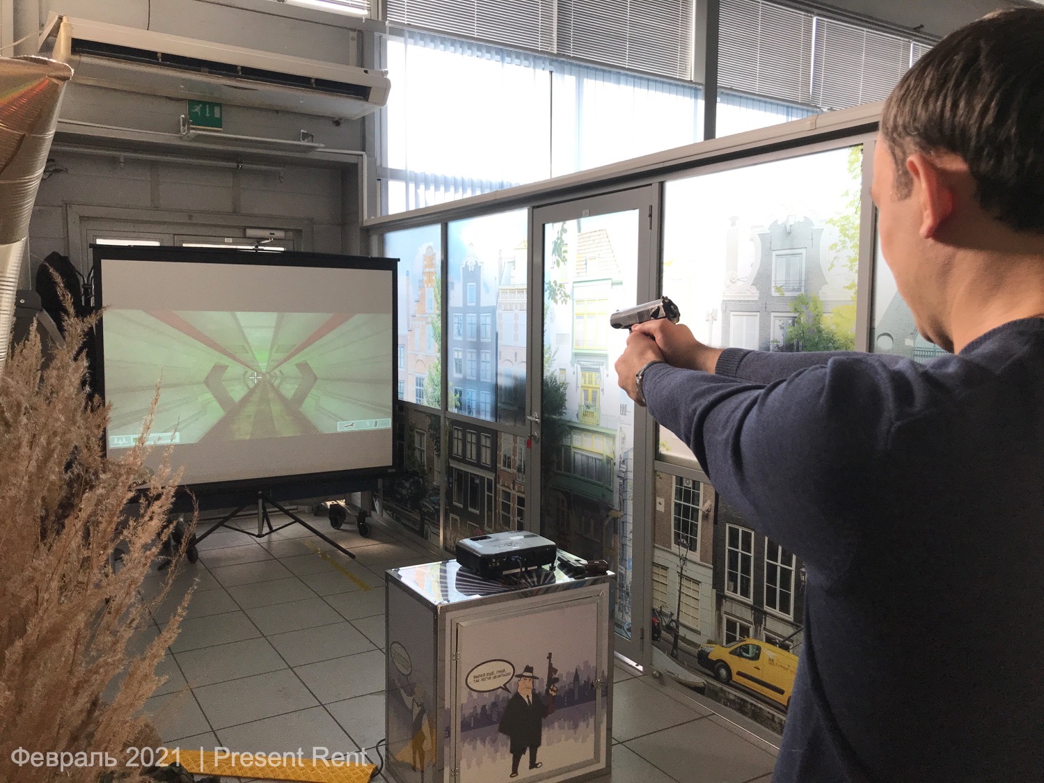 Центральным элементом праздничного мероприятия стал лазерный тир — современный интерактивный аттракцион, позволяющий безопасно стрелять по виртуальным мишеням. Лазерный тир состоял из большого экрана, на который проецировались различные игровые сценарии, и специального оружия с лазерной указкой. Этот формат развлечения идеально подходит для офисного пространства, так как не требует большой площади и полностью безопасен.