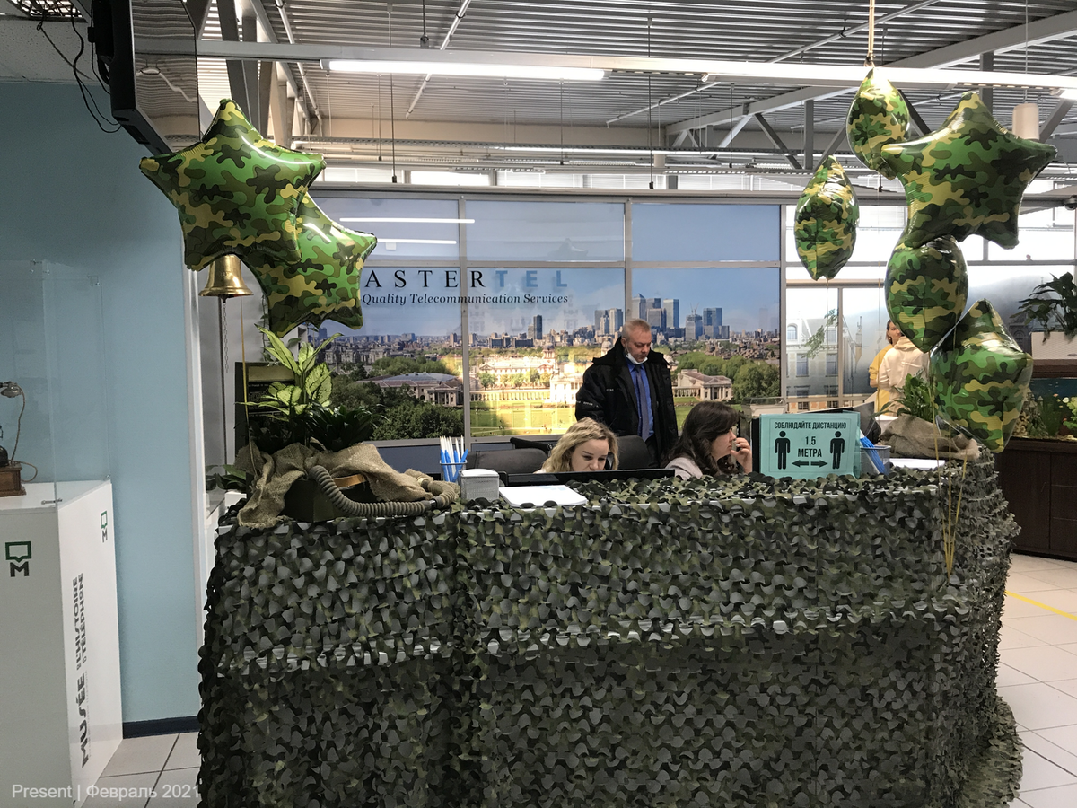 Офисное развлекательное мероприятие, посвящённое Дню защитника Отечества, прошло 23 февраля 2021 года в офисе компании «Мастертел». В этот праздник женщины компании решили поздравить своих коллег-мужчин, оформили зону ресепшена в праздничном стиле и организовали для сотрудников необычное развлечение — лазерный тир.