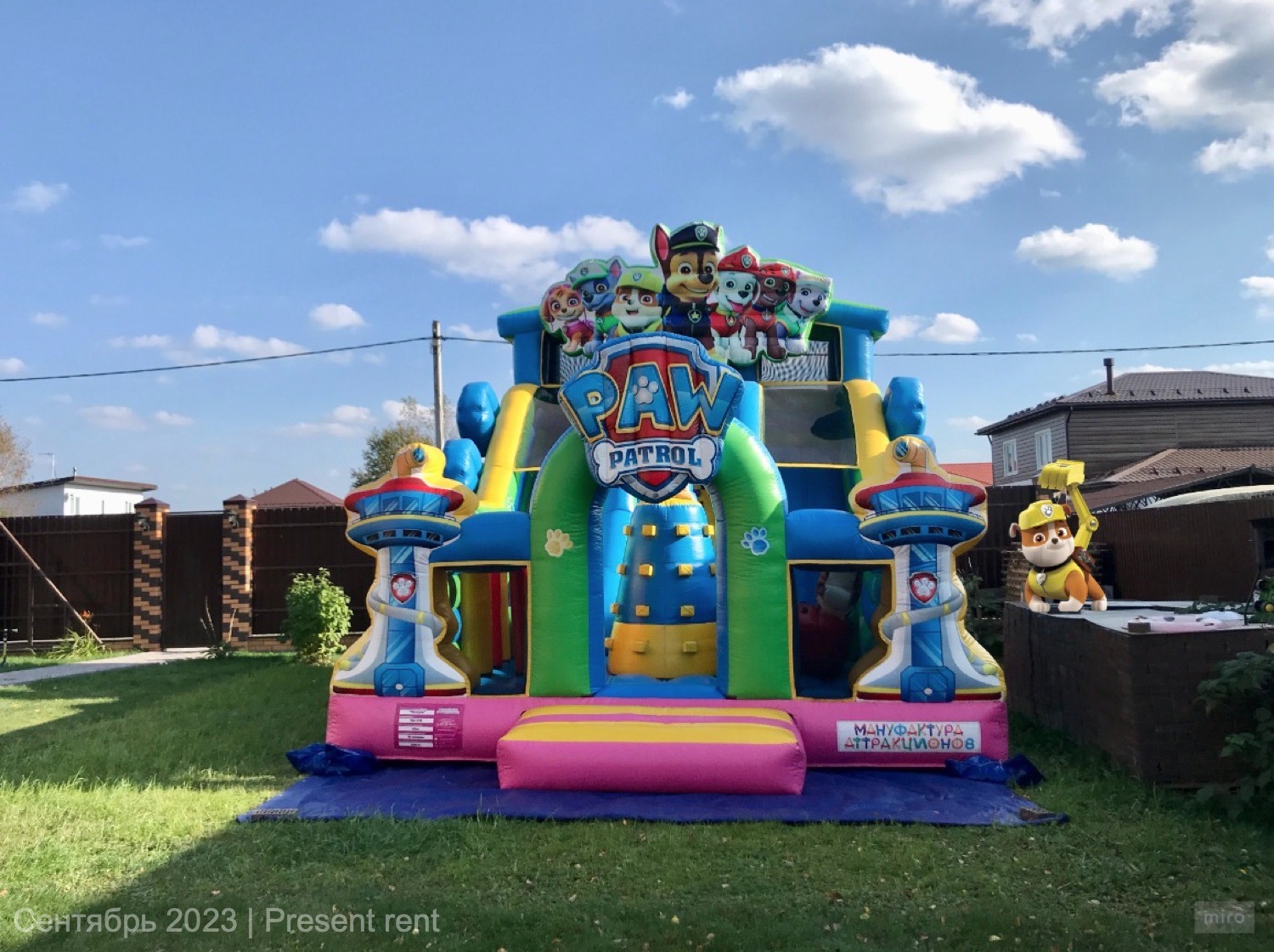 — Батут в стиле «Щенячий патруль» — с изображением известных щенков, двумя горками и скалодромом.
