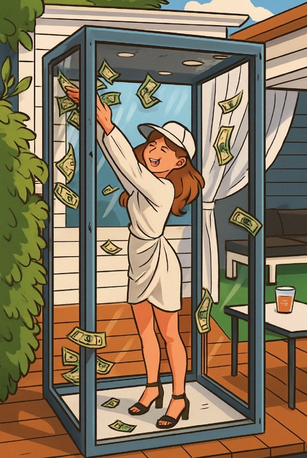 Денежная кабина — прозрачная будка высотой около 2 м и площадью 1×1 м. За кабинкой установлен мощный вентилятор 1,5 кВт, создающий интенсивный воздушный поток. Перед запуском внутрь помещают 200–300 фан-купюр, купонов или рекламных буклетов. Гость заходит, оператор закрывает дверь и включает вентилятор: поток поднимает бумагу и закручивает её в вихрь вокруг участника. За отведённое время гость пытается поймать как можно больше купюр — правила можно адаптировать под формат мероприятия.